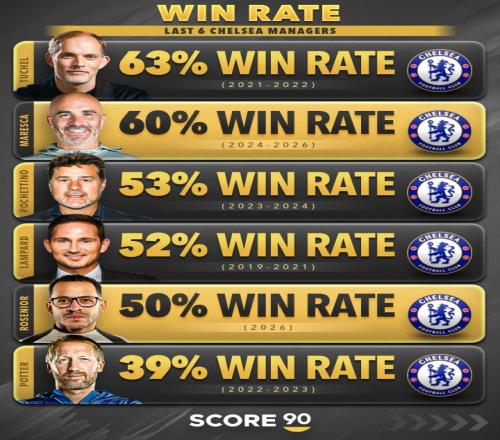 體育播報04月21日宣 Score90列出了近6任切爾西主帥的比賽勝率,羅塞尼爾僅50%排在倒數第二,而前任主帥馬雷斯卡以60%的勝率排在第二。