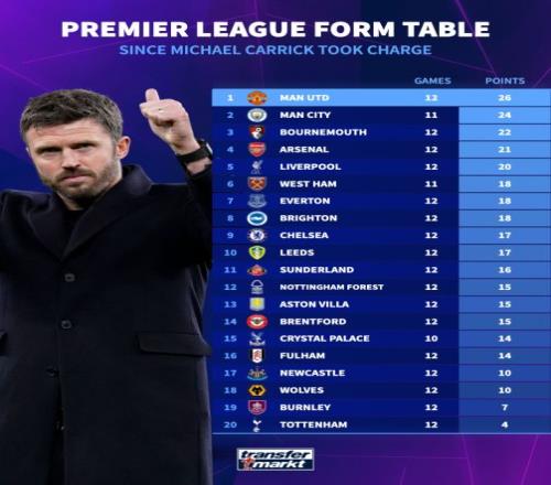 自從一月初接替阿莫林以來(lái),卡里克徹底扭轉(zhuǎn)了曼聯(lián)的局面,把球隊(duì)從英超第七帶到了第三。