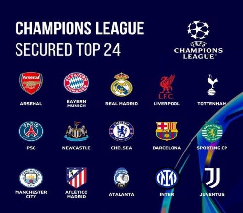 至少確保附加賽球隊:皇馬、利物浦、熱刺、巴黎、紐卡、切爾西、巴薩、葡萄牙體育、曼城、馬競、亞特蘭大、國米、尤文
