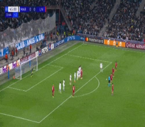 半場補時第2分鐘,索博斯洛伊主罰前場任意球,選擇直接貼地斬破門,利物浦1-0馬賽。