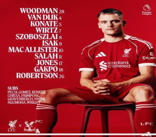 利物浦首發:28-伍德曼、8-索博斯洛伊、5-科納特、4-范戴克、26-羅伯遜、17-瓊斯、10-麥卡利斯特、11-薩拉赫、7-維爾茨、18-加克波、9-伊薩克