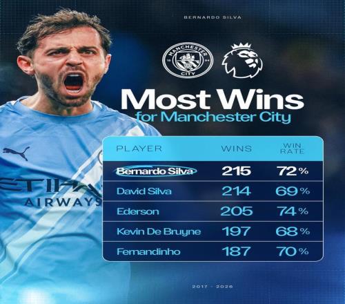在曼城與伯恩利的比賽中,B席完成了兩項(xiàng)里程碑。B席的出場(chǎng)次數(shù)超越上世紀(jì)60-70年代的名宿邁克-薩莫比,升至隊(duì)史第八。在1-0擊敗伯恩利后,B席取得了他在曼城生涯的第215場(chǎng)英超勝利,超越大衛(wèi)-席爾瓦,成為曼城隊(duì)史英超取勝場(chǎng)次最多的球員!