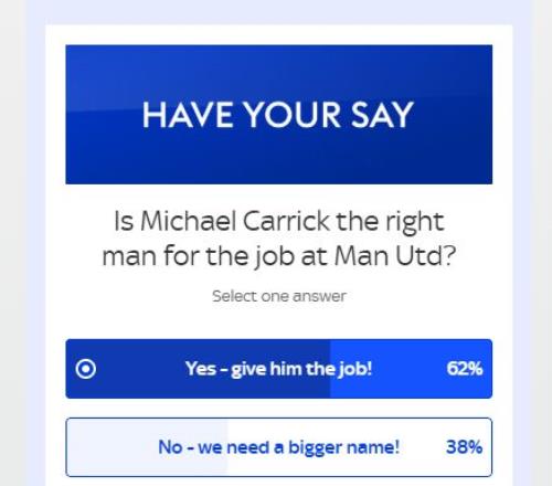 《天空體育》隨即進行了調查,62%的球迷認為卡里克是執教曼聯的合適人選,38%的球迷認為曼聯需要名氣更大的主帥。