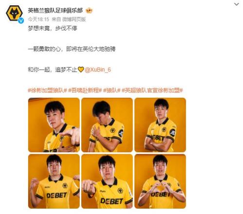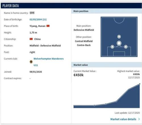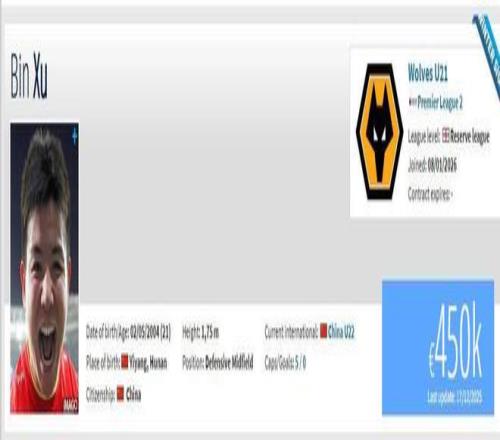 1月8日,徐彬正式加盟英超狼隊,身價45萬歐元