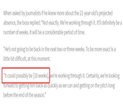 卡里克表示:「可能需要10周時(shí)間,我們正在積極為他治療。當(dāng)然,希望他能盡快回到球場,在結(jié)束之前能重新參加比賽。這確實(shí)是一個(gè)打擊,失去球員,他們無法參賽,總是令人失望,因?yàn)殛嚾菥蜕倭艘粋€(gè)選擇。尤其是帕特里克這樣,他在過去幾周發(fā)揮如此重要作用,真正提升了球隊(duì)的水平。」
