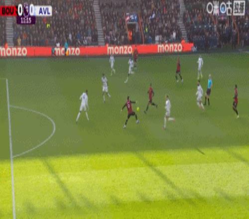 第22分鐘,摩根-羅杰斯右路勁射破門,維拉1-0領先伯恩茅斯