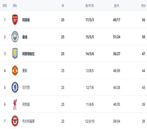 在積分榜上,阿森納依然占據榜首位置:17勝5平3負,拿到56分。而曼城贏下這場關鍵比賽之后,總積分達到50分,排名第2,與阿森納有6分的差距。冠軍的爭奪還是有一定的懸念,只是曼城想要追上去難度不小。阿斯頓維拉掉隊了,只拿到47分,排名第3,與阿森納有9分的差距。曼聯的一波連勝讓其穩居第4名,拿到44分。切爾西拿到43分緊隨其后,排名第5。利物浦輸球之后,依然是39分,排名第6,與歐冠區的曼聯有5分的差距。布倫特福德也是39分,排名第7。