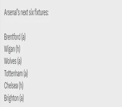 阿森納未來6場比賽:客戰布倫特福德、主戰維岡、客戰狼隊、客戰熱刺、主戰切爾西、客戰布萊頓。