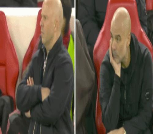 此時,鏡頭來到場邊的兩位光頭主帥,反應可謂截然不同。斯洛特揮拳轉身慶祝,瓜迪奧拉一臉無奈!