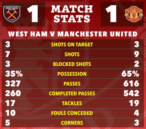 努諾·桑托的西漢姆采用541陣型密集防守,曼聯(lián)掌控球權,但似乎不知道如何是好,高達65%的控球率,卡里克的球隊只轉化為3次有效射門。
