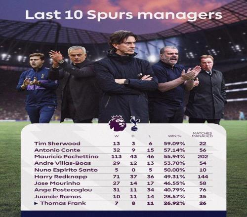 去年夏熱刺支付1000萬鎊解約金,從布倫特福德挖來弗蘭克。正如熱刺換帥公告所言,俱樂部耐心足夠,兩個半月以來一直力保新帥。但身為傳統六強之一的熱刺,不可能對持續的糟糕戰績無動于衷。弗蘭克執教熱刺26場英超,7勝8平11負積29分,場均1.12分是隊史執教5場及以上教練有記錄以來最低。此時不炒,更待何時?