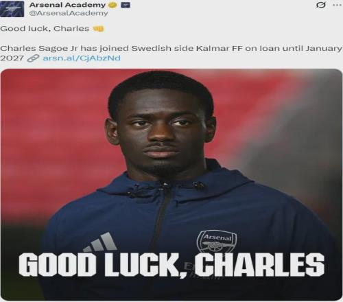 官方:阿森納宣布查爾斯-薩戈租借加盟瑞典俱樂(lè)部卡爾馬FF直到2027年1月。