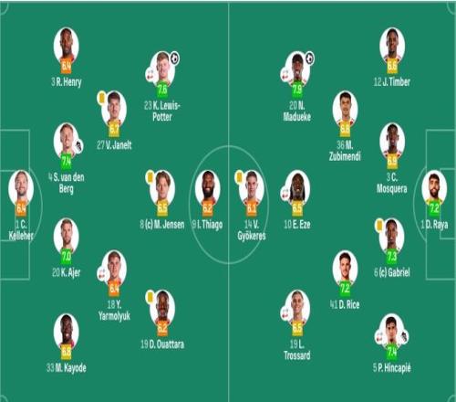 阿森納首發(fā):1-拉亞、3-莫斯克拉、5-因卡皮耶(81'33-卡拉菲奧里)、6-加布里埃爾、12-廷伯、10-埃澤(46'8-厄德高)、36-蘇維門(mén)迪、41-賴(lài)斯、14-約克雷斯、19-特羅薩德(81'11-馬丁內(nèi)利)、20-馬杜埃凱(70'7-薩卡)