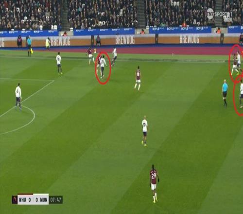 而且,外圍防守的更大問題是卡塞米羅和達洛特沒卡住線路,也沒有跟上立刻反插的薩默維爾,他和鮑文一起成為了沖擊點位,只不過是中鋒卡斯特利亞諾斯的傳球沒有找到他們,被馬奎爾再次解圍,但解圍不遠,還是被西漢姆聯拿下,然后聯系到了右路,形成了傳中: