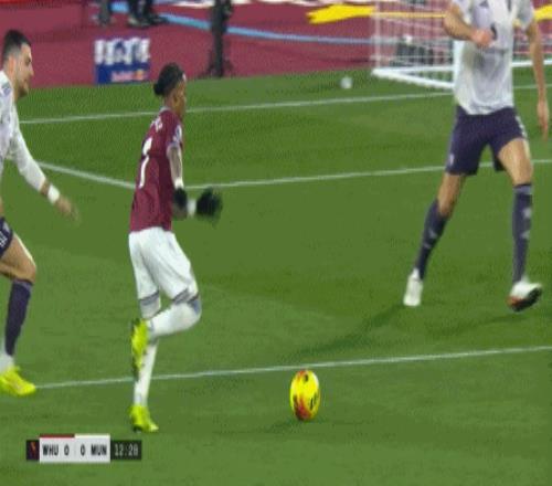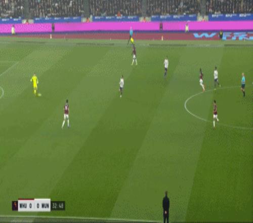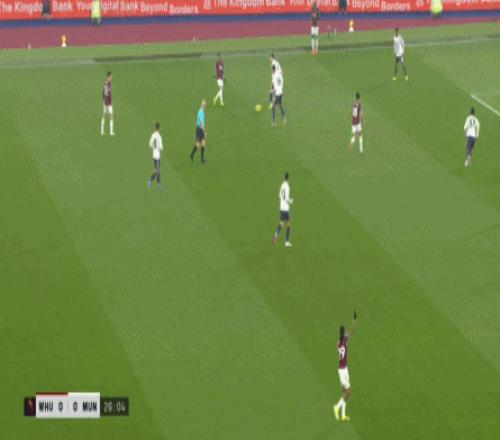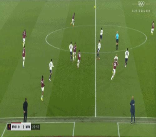 第27分鐘,西漢姆聯這次從界外球起步,鮑文逼迫馬奎爾橫移解圍,結果外圍丟掉一點,再次讓馬特烏斯完成了轉移: