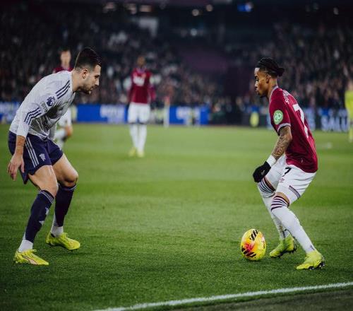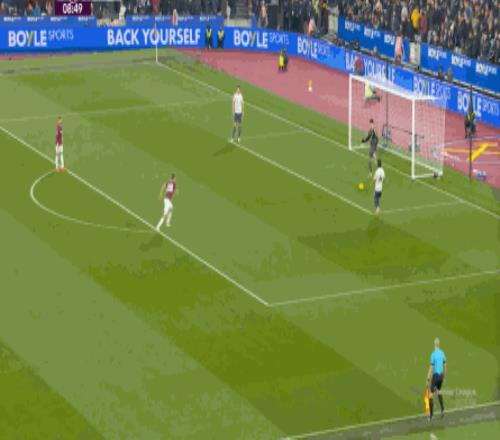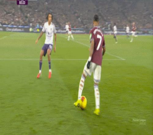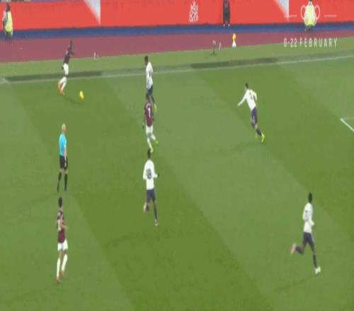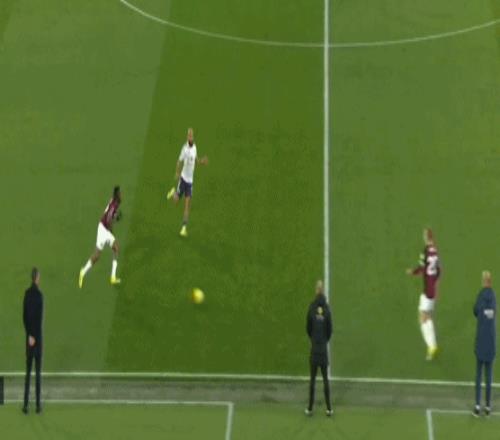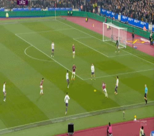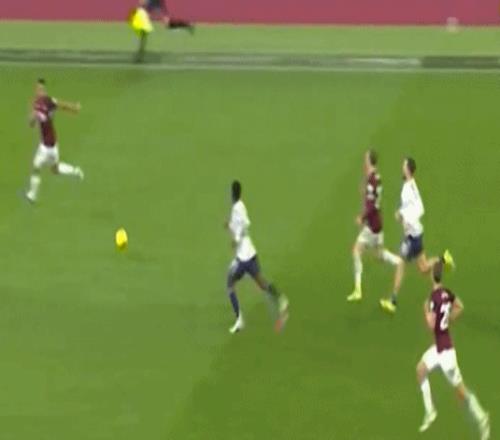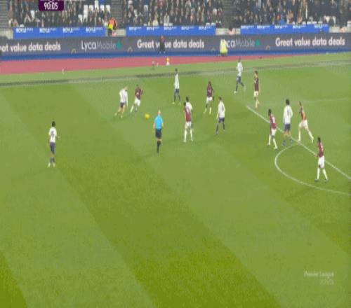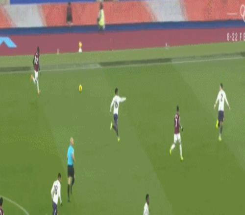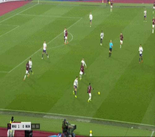 然后,鮑文擺脫了梅努,再次完成了一次橫向轉移,西漢姆聯又把球打到了左側: