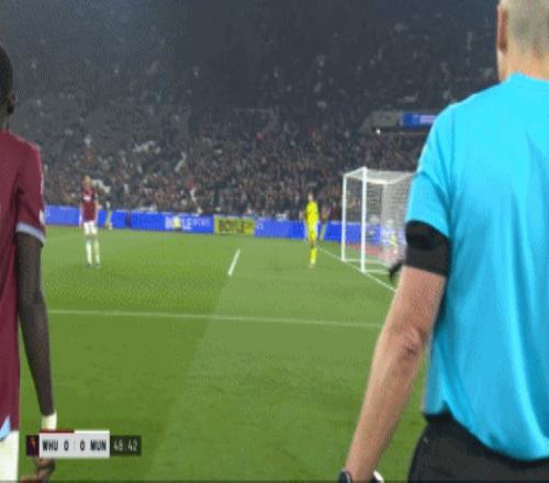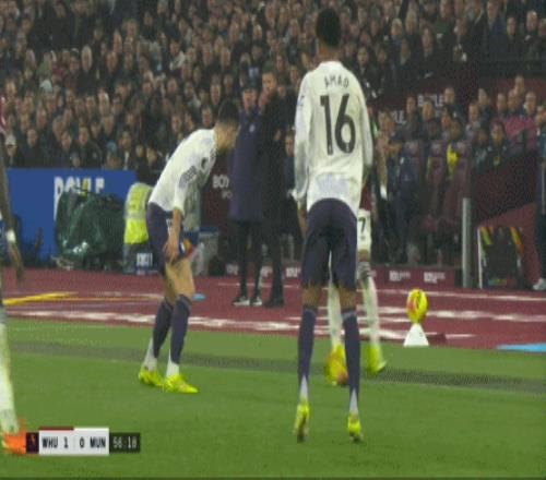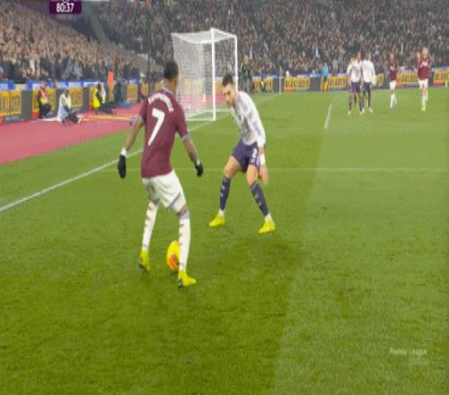 等到下半場回來,西漢姆聯打出了上半場從未用過的進攻套路,那就是右路,因此遭殃的不是達洛特、卡塞米羅和馬奎爾,問題來到了梅努的身上: