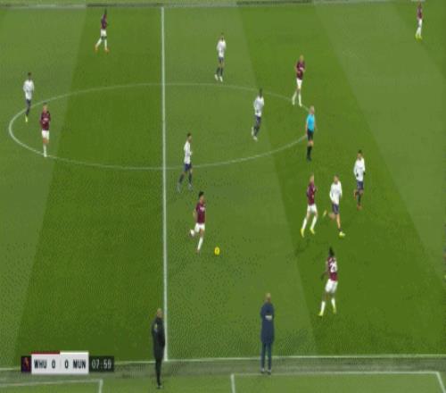 但是,西漢姆聯雖然打穿了曼聯的逼搶線,并且完成了橫向轉移,但并未因此打出速度和推進,球權來到右側,面臨在中線高度建立進攻的局面。
