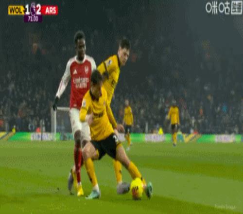第90+3分鐘,加布里埃爾和拉亞配合失誤,卡拉菲奧里烏龍,狼隊2-2阿森納