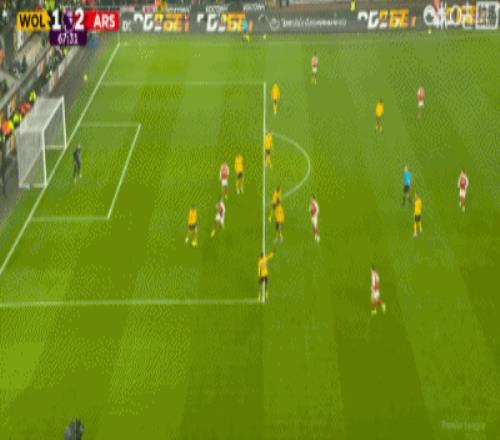 第61分鐘,布埃諾禁區右路兜射遠角破門,阿森納2-1狼隊