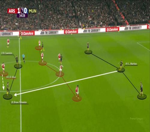 曼聯的主要套路還是二打二的配合,像3-2擊敗阿森納之戰,B費和多古就這樣突破中路,攻入了球隊的第二球。
