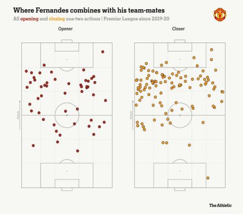 2019年8月以來,只有利物浦的安迪·羅伯遜和曼城的貝爾納多·席爾瓦進行的二過一配合次數比B費多。與B費默契最好的,是過去的拉什福德,以及如今的邊后衛盧克·肖和迪奧古·達洛。