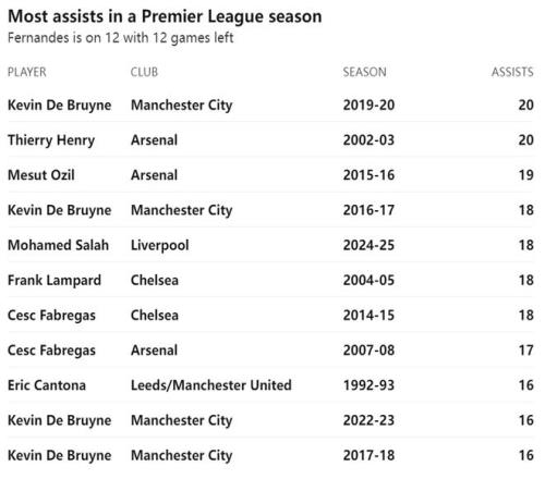 數據顯示,目前B費27輪英超12次助攻,還需要8次助攻,才能追平2002/03賽季阿森納的亨利,以及2019/20賽季的德布勞內共同保持的英超單賽季20次助攻最高紀錄。