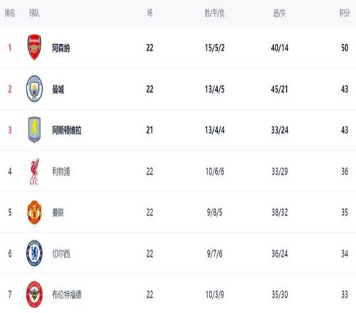 在積分榜上,阿森納15勝5平2負的戰績,拿到50分,排名榜首位置。曼城連續4輪不勝,丟掉了太多分數,總積分只有43分,屈居第2名,落后了7分。阿斯頓維拉在少賽一場的情況下也是43分,暫時排名第3。利物浦以36分排名第4。曼聯總積分達到35分,排名第5,只比利物浦少1分。切爾西34分排名第6。