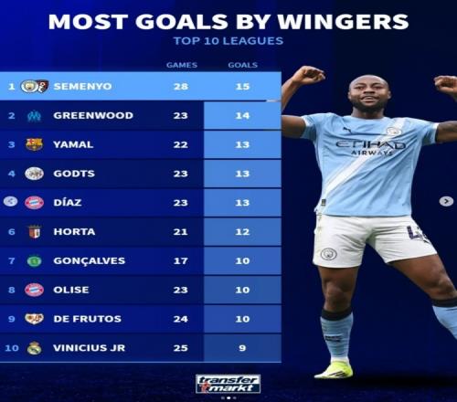 體育播報3月6日宣 德轉盤點了本賽季歐洲前十聯賽邊鋒球員進球榜,其中塞梅尼奧居首,具體如下: