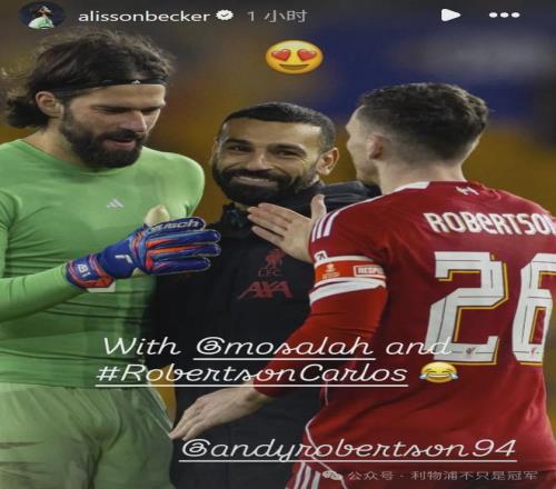 同樣是“老家伙”的阿利森,似乎也明白了球迷的心意,他賽后曬出自己與薩拉赫和羅伯遜的同框照,并直接稱羅伯遜為:羅伯遜-卡洛斯!