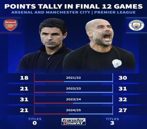 2024/25:阿森納21分,曼城27分