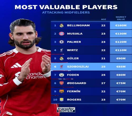 以下為德轉(zhuǎn)上期攻擊型中場身價(jià)top10: