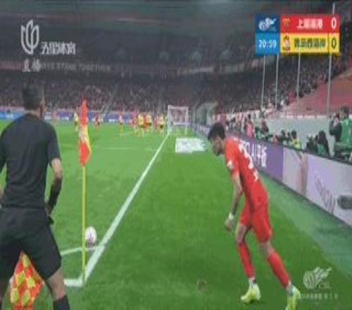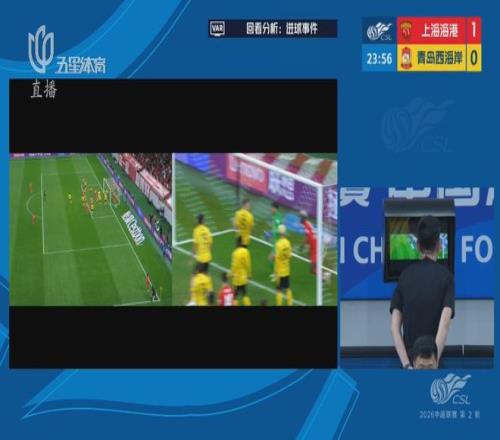 第22分鐘,上海海港通過角球打入一球,李帥罰向前點(diǎn)被解圍后,萊昂納多在后點(diǎn)補(bǔ)射得手。但主裁判經(jīng)VAR裁判提示后親自察看回放,示意海港外援讓·克勞德沖撞門將在先,進(jìn)球無效。