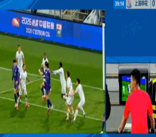 第39分鐘,巴頓開出角球,申花解圍之后快速反擊,并且獲得角球。然而,就在高天意準備主罰角球的時候,視頻助理裁判介入判罰,并且要求主裁判回看慢鏡頭。