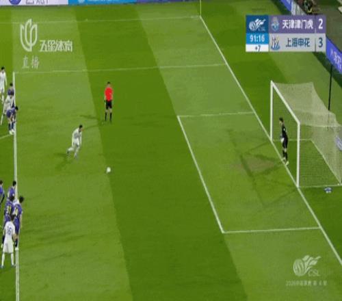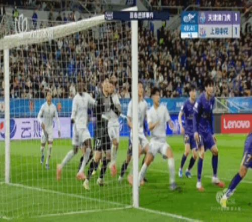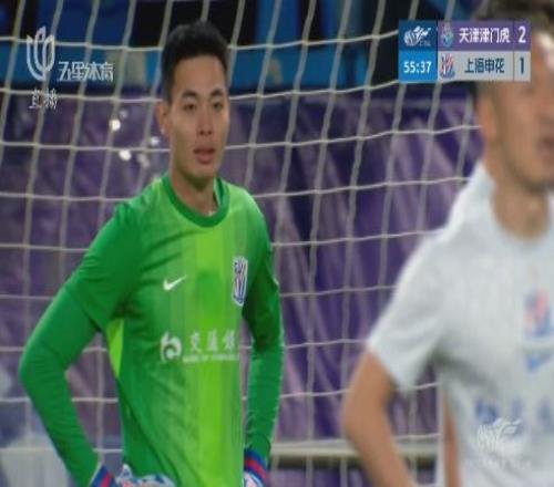 第57分鐘,天津津門虎前場左側(cè),哈達(dá)斯在禁區(qū)外圍一腳似傳似射,薛慶浩及時下地?fù)渚鹊霈F(xiàn)脫手失誤,球從他身下漏過后滾向球門,右側(cè)基萊斯拍馬趕到打空門得手,申花1-2再度落后......