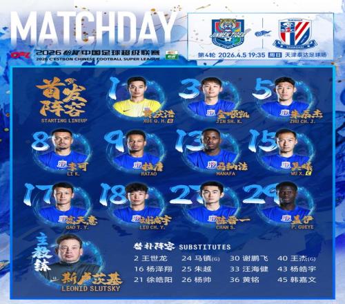本場比賽,主帥斯盧茨基繼續(xù)派上金順凱和朱辰杰組成中后衛(wèi)搭檔,陳晉一和馬納法分居左右;吳曦和李可搭檔雙后腰;劉誠宇獲得首發(fā)機會,搭檔拉唐、高天意和蓋伊組成前場攻擊群。