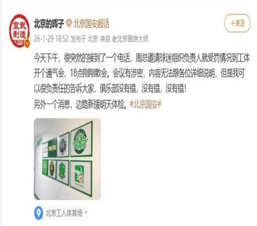 北京時(shí)間1月29日,北京國(guó)安球迷代表“北京的暉子”在社媒發(fā)文稱,自己下午接到電話,作為球迷組織負(fù)責(zé)人,受邀參與...