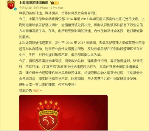但是上海上港面對中國足協的處罰卻完全相反,表示堅決擁護和全面接受,深刻認識到錯誤,并向受影響的球迷、合作伙伴以及社會各界表達歉意。