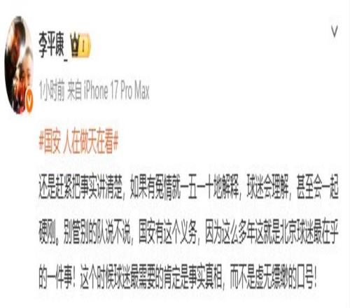 隨后,李平康又表示,“還是趕緊把事實(shí)講清楚,如果有冤情就一五一十地解釋?zhuān)蛎詴?huì)理解,甚至?xí)黄鹩矂偂e管別的隊(duì)說(shuō)不說(shuō),國(guó)安有這個(gè)義務(wù),因?yàn)檫@么多年這就是北京球迷最在乎的一件事!這個(gè)時(shí)候球迷最需要的肯定是事實(shí)真相,而不是虛無(wú)縹緲的口號(hào)!”