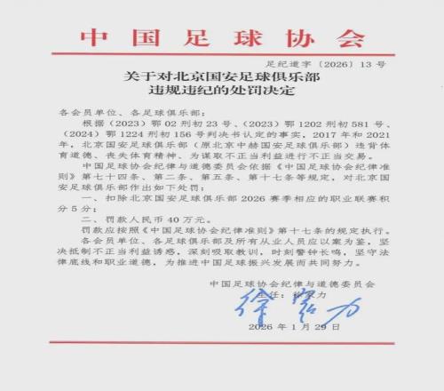 在中國足協公布的對北京國安的罰單中顯示:2017年和2021年,北京國安(原北京中赫國安)違背體育道德、喪失體育精神、為謀取不正當利益進行不正當交易,扣除北京國安足球俱樂部2026賽季相應的職業聯賽積分5分,罰款人民幣40萬元。