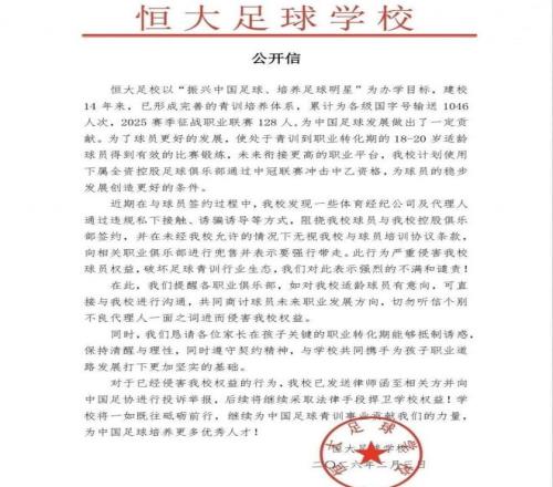 拒絕為他人做嫁衣裳!日前,恒大足校罕見(jiàn)公開(kāi)發(fā)文譴責(zé)這種現(xiàn)象(上圖)。表示有些體育經(jīng)紀(jì)公司私底下挖角這些U17青訓(xùn)精英,損害了恒大足校的利益和青訓(xùn)生態(tài)。