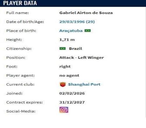 德轉顯示,加布里埃爾與上海海港簽署了一份為期2年的合同。