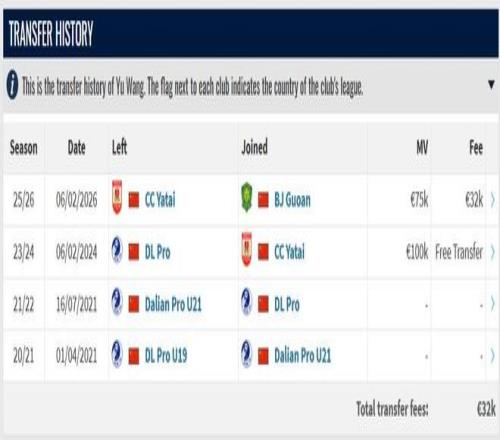 據德轉信息顯示,王禹今年冬窗從長春亞泰加盟北京國安的轉會費為3.2萬歐元(約合人民幣26萬元)。