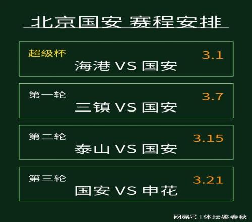 而新賽季聯(lián)賽賽程也陸續(xù)在網(wǎng)上傳開,看完前三輪對(duì)陣的形勢(shì),不少球迷第一反應(yīng)是強(qiáng)度真不低。3月7日,國(guó)安在客場(chǎng)對(duì)陣武漢三鎮(zhèn),3月15日再到客場(chǎng)挑戰(zhàn)山東泰山,3月21日回到主場(chǎng)迎戰(zhàn)上海申花。再算上超級(jí)杯面對(duì)海港,新賽季的前四場(chǎng)比賽就是硬仗。