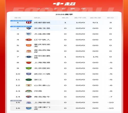 隨著揭幕戰(zhàn)結束,2026 賽季中超積分榜也完成首次更新,格局十分特殊。成都蓉城憑借大勝暫時登頂積分榜榜首,而慘敗的深圳新鵬城依舊排在第 7 位,身后還有 9 支因處罰以負分起步的球隊,成都蓉城甚至一度領先榜尾球隊 13 分。