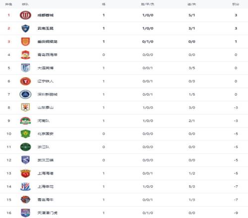 在積分榜上,成都蓉城排名第1,拿到3分。同樣拿到3分的云南玉昆排名第2。重慶銅梁龍拿到1分,排名第3。青島西海岸、大連英博、遼寧鐵人和深圳新鵬城都是0分,排名第4到第7。山東泰山負3分,排名第8。