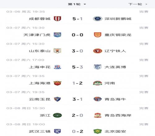 體育播報03月08日宣 中超首輪全部比賽戰罷,新賽季第一輪排名出爐。