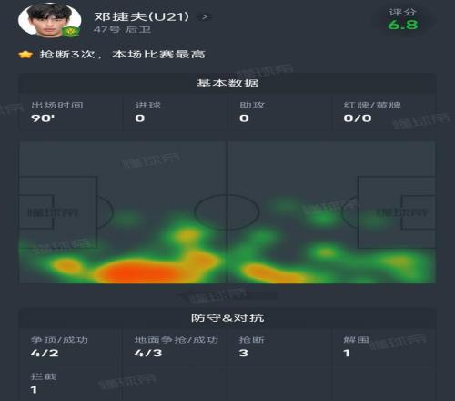 第一個,能被國安新任主帥、上賽季英超熱刺助教蒙哥馬利第一場就安排首發,果然是有點東西的。鄧捷夫今晚中超首發并踢滿全場,3次搶斷全場最高,還有1次解圍,1次攔截,3次地面爭搶成功和2次爭頂成功,這數據對于18歲小將的首秀簡直是驚艷了!